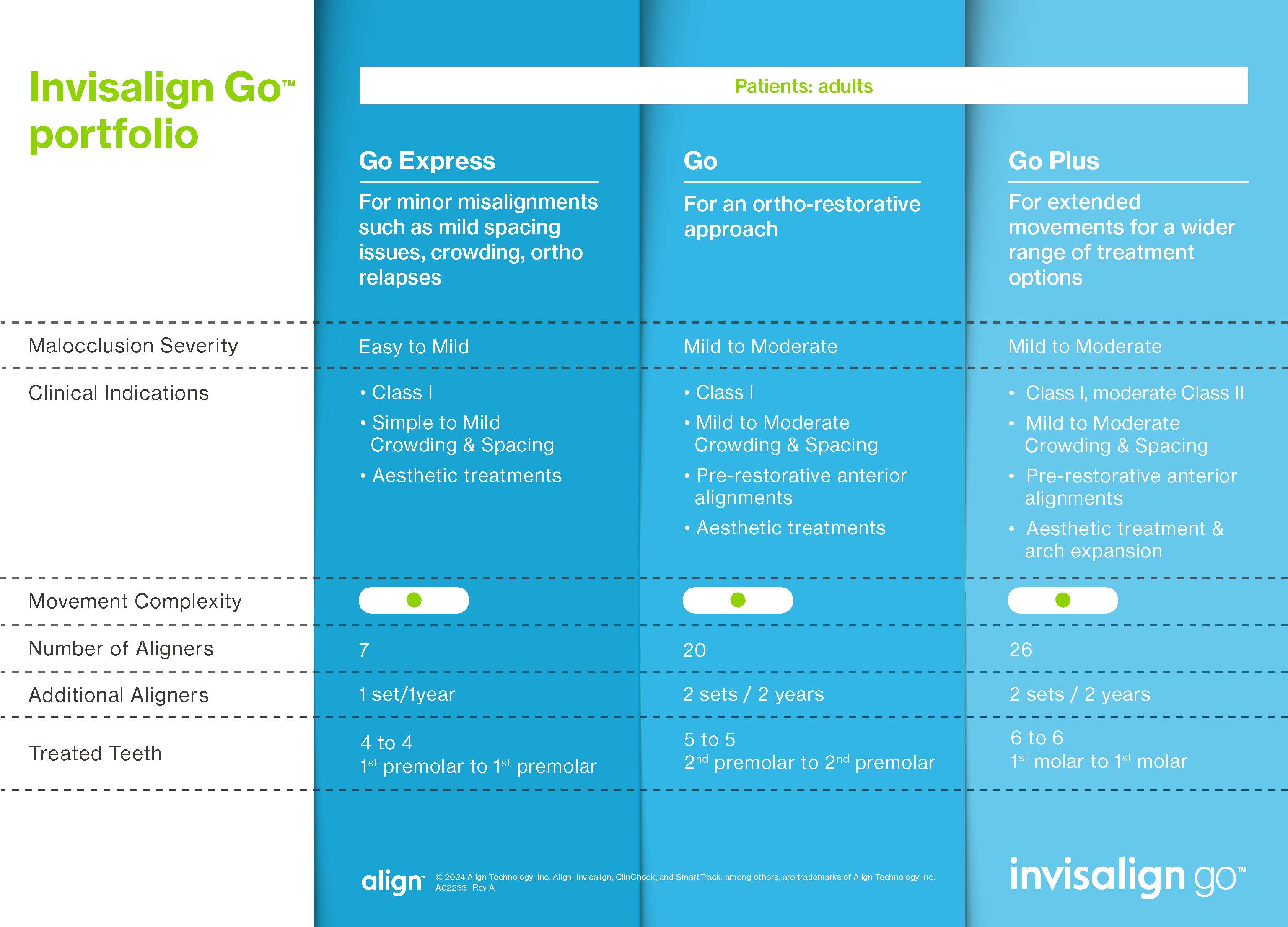 The Invisalign Go portfolio supports treatment for a wide range of simple, mild and moderate malocclusions, allowing dentists to select the appropriate treatment option for the condition they aim to address based on specific parameters.