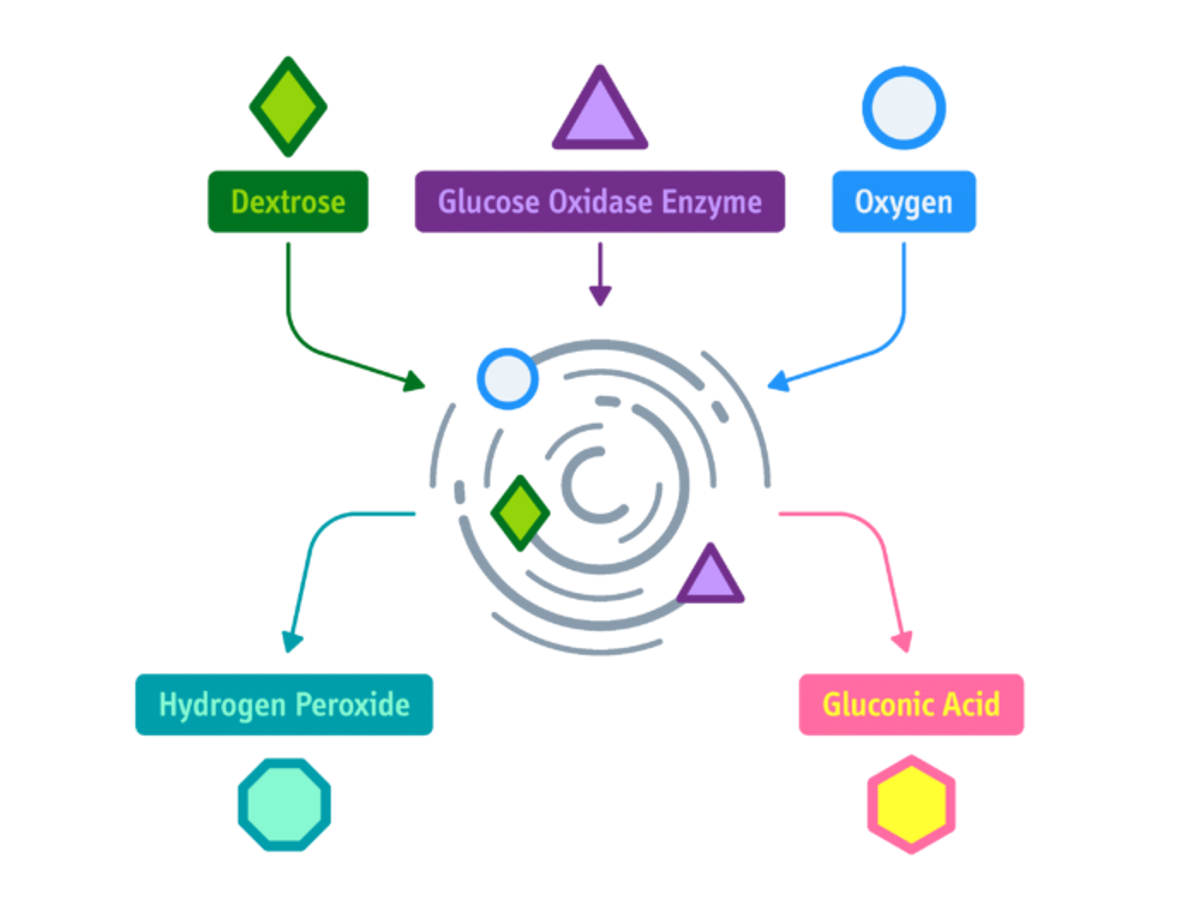 The enzymatic reaction happens when glucose oxidase and dextrose react with each other and with oxygen in the air. At the end of this process, no dextrose is left. (Image: Curaden)