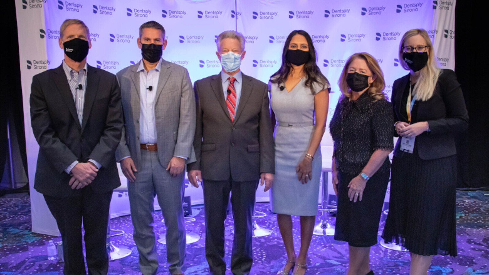DS World press conference speakers. From left to right: Don Casey, Dr. Dan Butterman, Dr. John West, Dr. Shivi Gupta, Dr. Terri Dolan and Marion Par-Weixlberger. (Image: Dentsply Sirona)