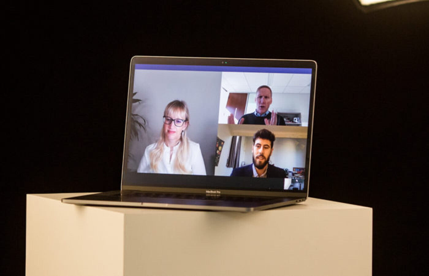The interview with Don Casey (top right) and Marion Par-Weixlberger (Vice President Corporate Communications and Public Relations at Dentsply Sirona; left) was conducted, fittingly, via a videoconferencing tool. (Image: Dentsply Sirona)