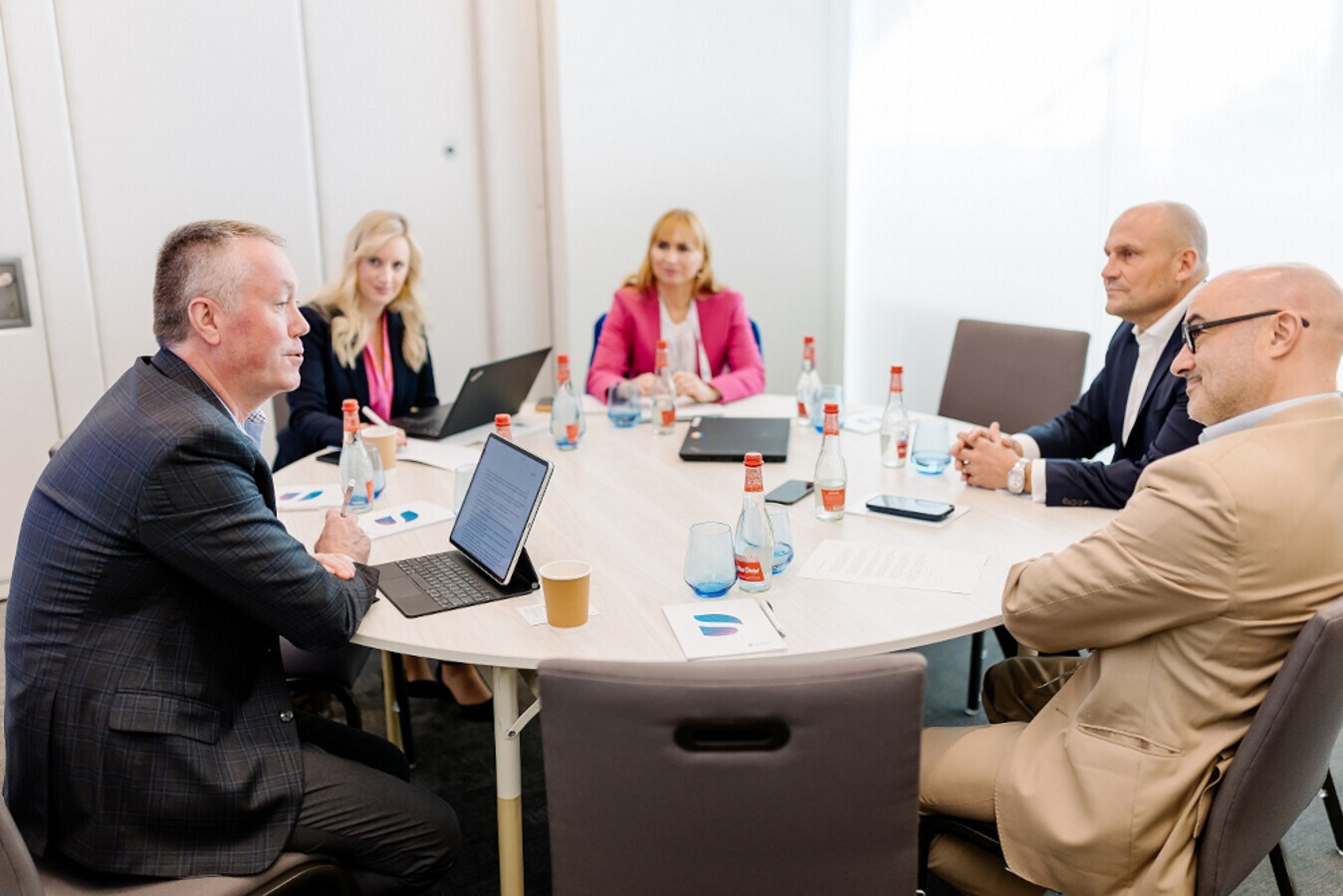Left to right: Dentsply Sirona CEO Simon Campion, Vice President Public Relations and Corporate Communications Marion Par-Weixlberger, and Senior Corporate Communications Manager Anna Bruns; and Dental Tribune International Chief Marketing Officer Lars Hoffman and CEO Torsten Oemus. (Image: Dentsply Sirona)