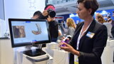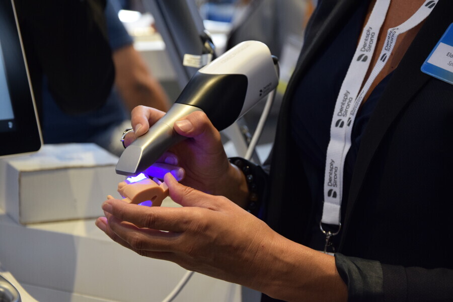 Élodie Cantuel, CAD/CAM sales specialist at Dentsply Sirona, demonstrating the company’s Primescan intra-oral scanner. (Photograph: Franziska Beier, DTI)