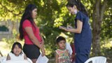 Fabiana Schleder Ruiz, Global Marketing Manager at Dentsply Sirona, distributing tooth cleaning kits to the indigenous people. (Photograph: Dentsply Sirona)