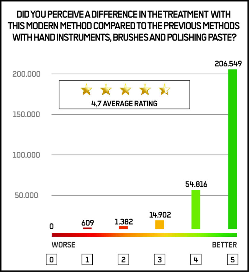 Fig. 1: Patients love Guided Biofilm Therapy. The vast majority clearly prefer the systematic and risk-adapted protocol, 99.3% of them giving it a 3-, 4- or 5-star rating. (Image: EMS)