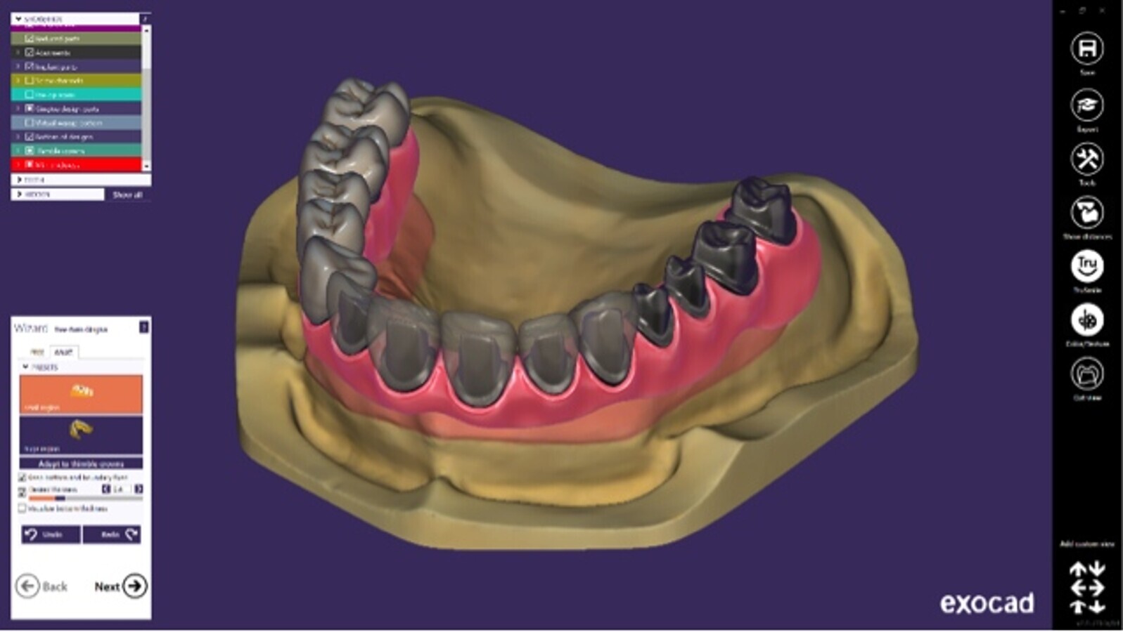 The improved thimble crown workflow for virtual gingiva-supported frameworks significantly reduces design time while increasing overall quality and consistency. (Image: exocad)