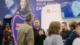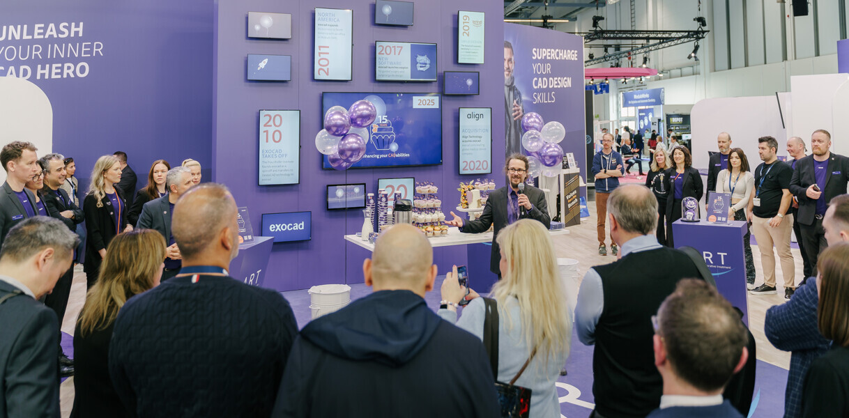 exocad celebrating their 15th anniversary at their IDS booth with CEO Tillmann Steinbrecher