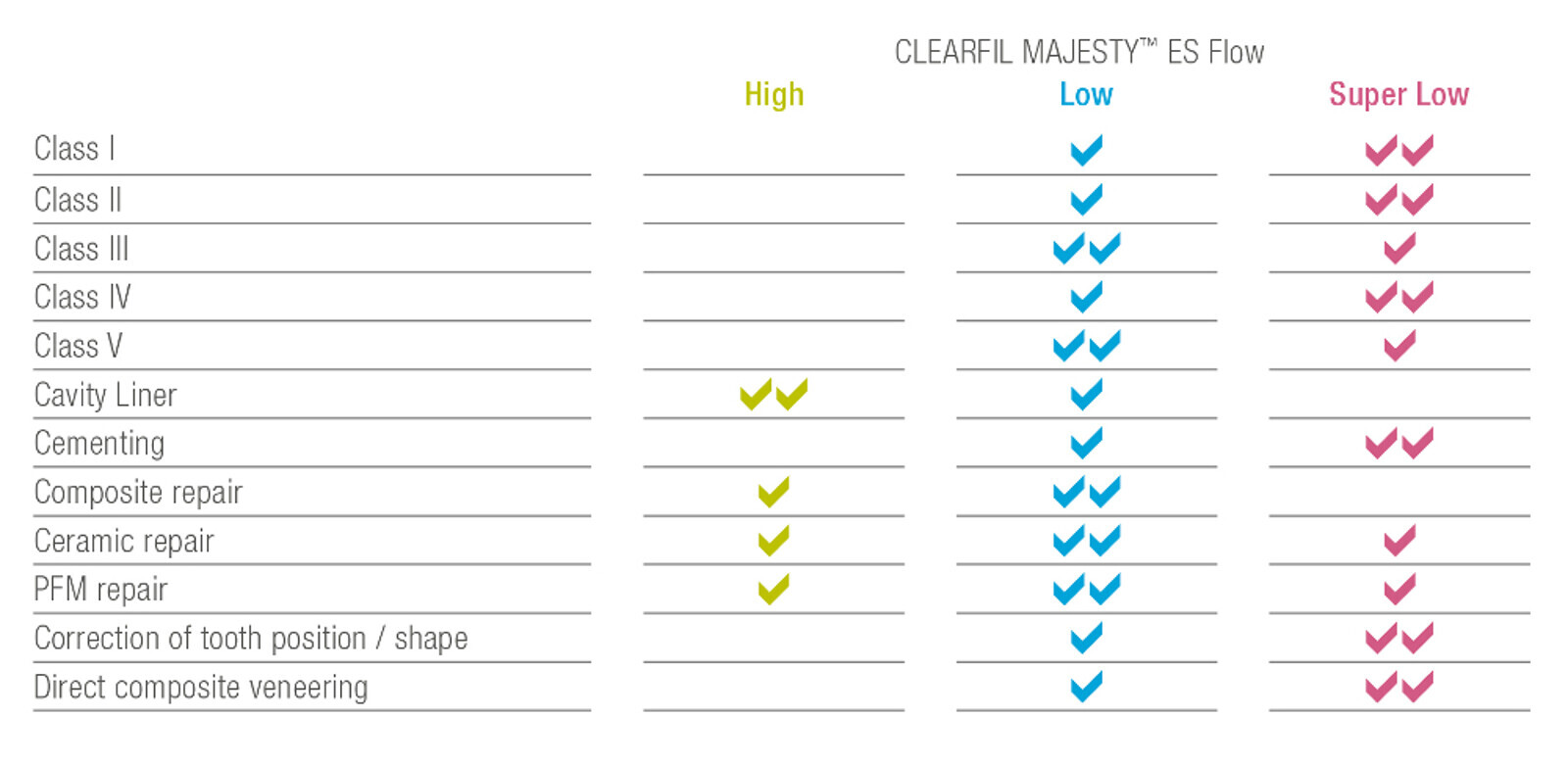 Table 1: Recommended areas of application of the three variants of CLEARFIL MAJESTY ES Flow.