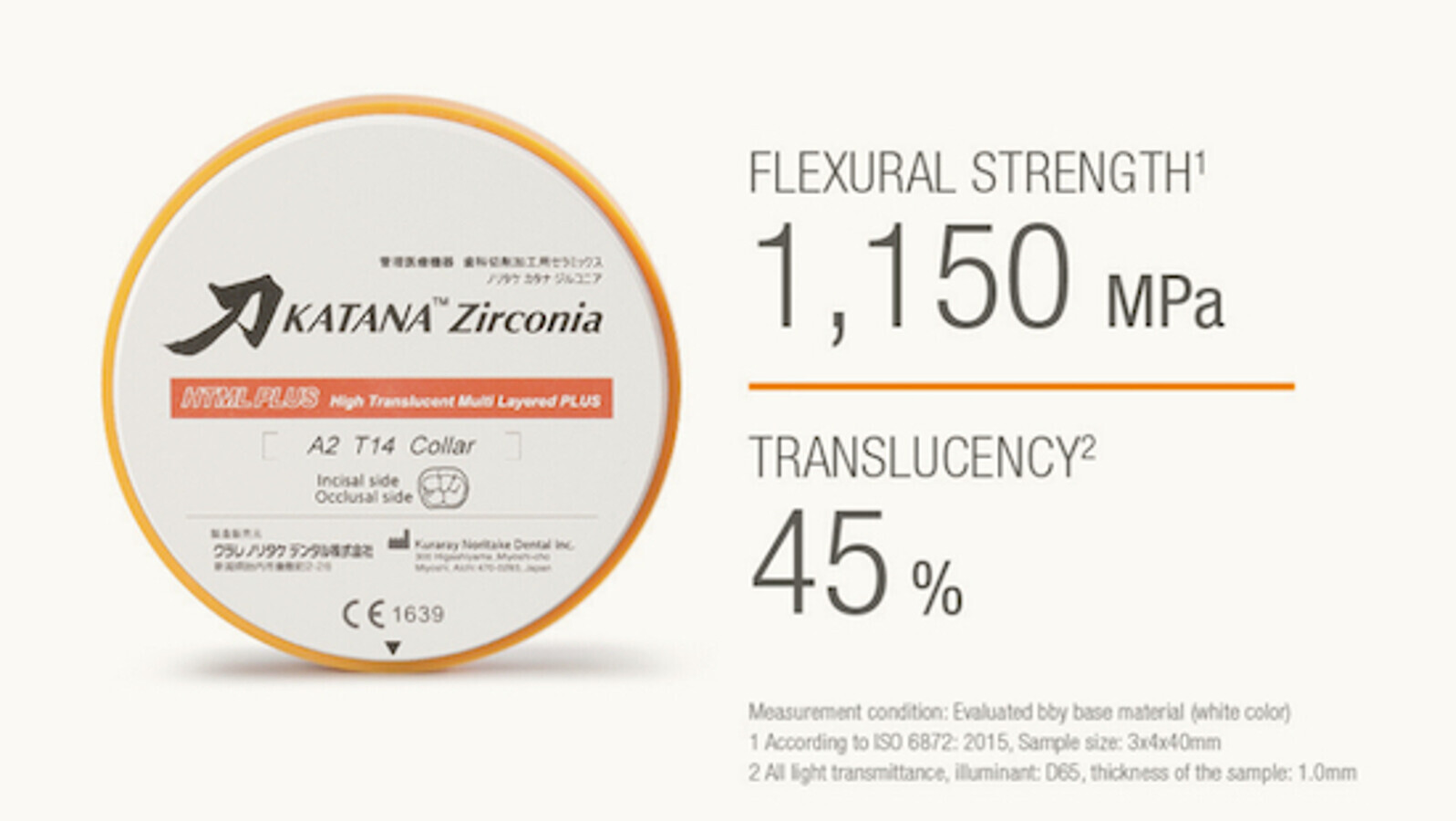 The “PLUS” refers to additional benefits, such as the material’s improved optical properties. KATANA Zirconia HTML PLUS offers an increased translucency of 45% (compared with 43% for KATANA Zirconia HTML) and an even more natural shade appearance of the manufactured restorations. At the same time, a high flexural strength (1,150 MPa) is maintained, providing for an unlimited range of indications.