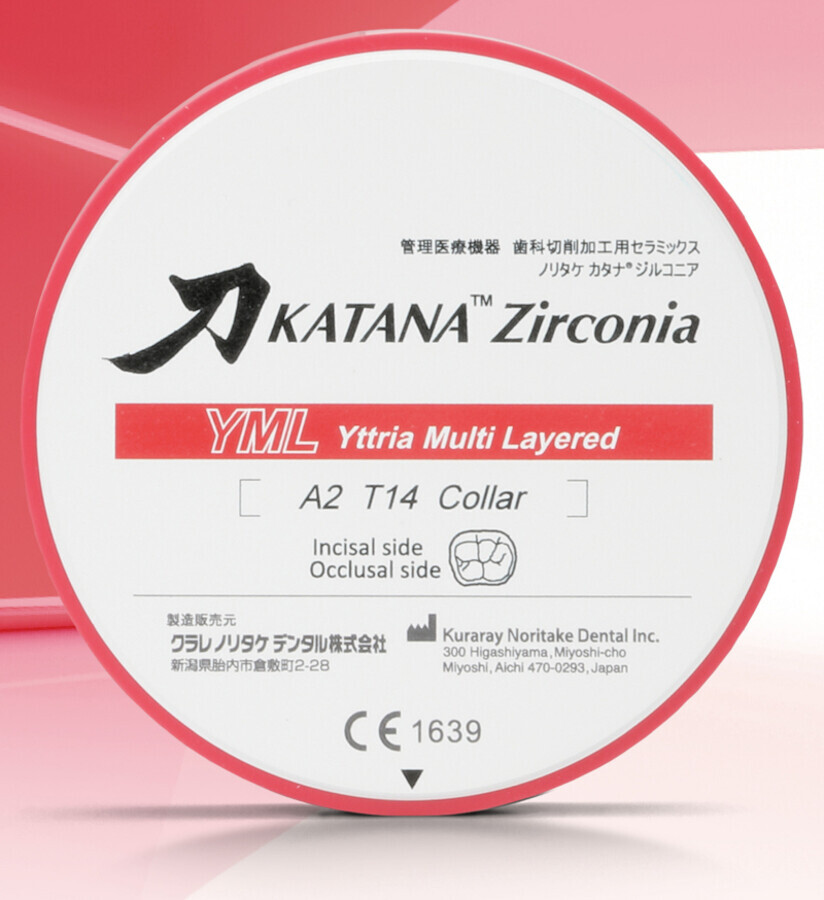 KATANA Zirconia YML is based on a new raw material technology derived from decades of zirconia experience. It is a combination of high translucency, flexural strength and a proven multilayered colour structure. The special structure results from a combination of new raw materials with different levels of yttrium oxide content. This makes KATANA Zirconia YML the ideal all-rounder with which work processes can be standardised, streamlined and simplified.