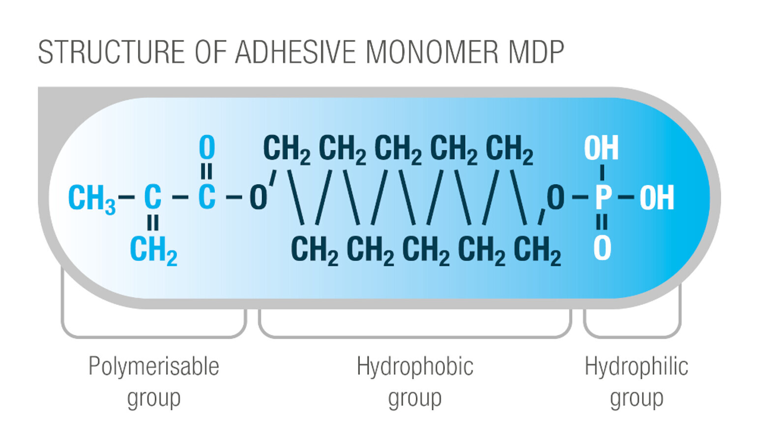 The MDP monomer consists of three essential parts: a polymerisable group, a hydrophobic group and a hydrophilic group. The co-polymerisable methacrylate group has a terminal double bond, enabling polymerisation. The large hydrophobic alkylene group—also referred to as the spacer—has the task of maintaining a delicate balance between the hydrophobic and hydrophilic properties of the monomer and offers great resistance to degradation. The hydrophilic phosphate group is responsible for acidic demineralisation, for chemical bonding with calcium in hydroxyapatite and for bonding with zirconia1 and with metal.
