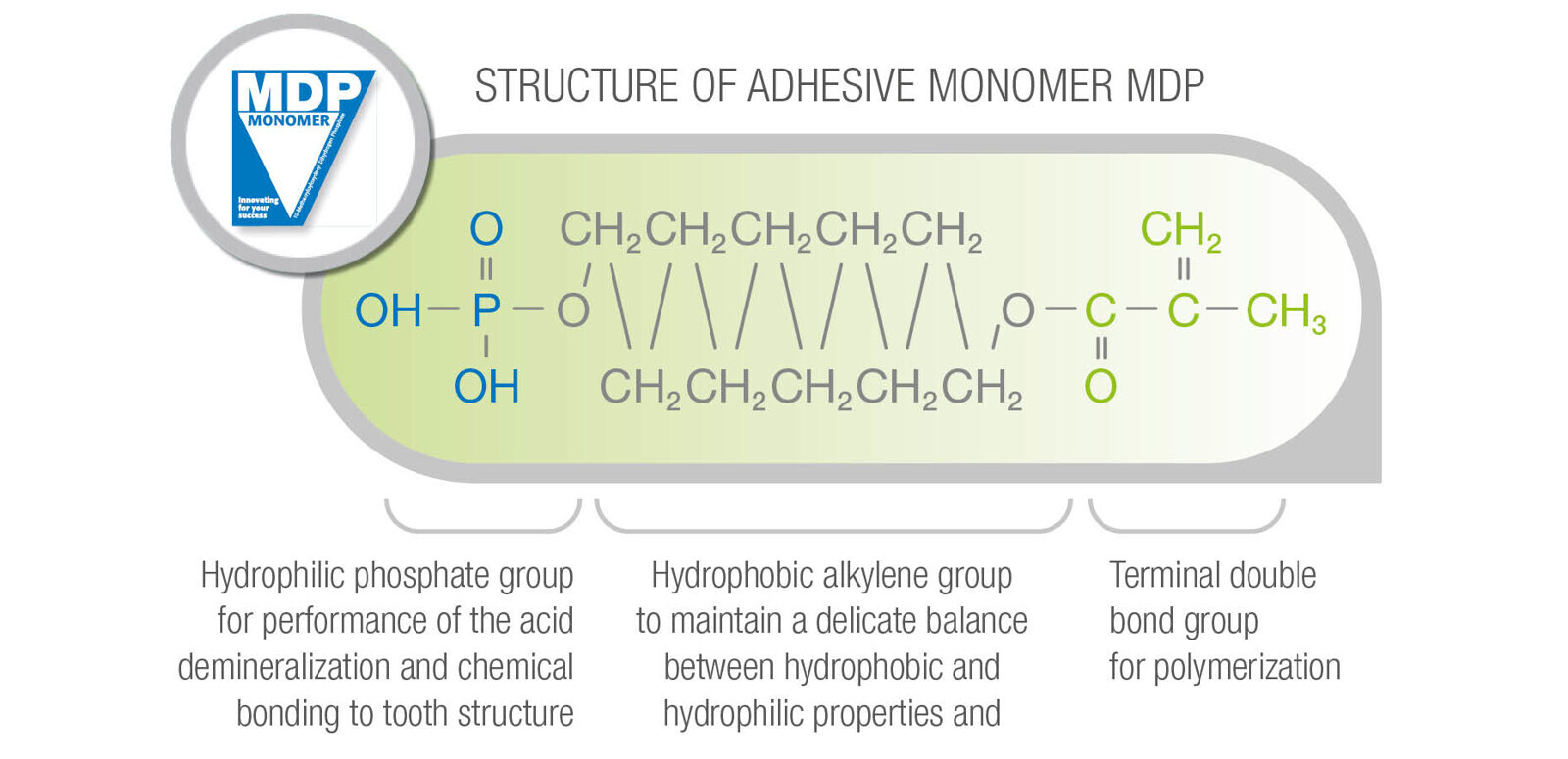 In order to achieve long-term bonding to tooth structure (especially dentine), Kuraray Co., a parent company of Kuraray Noritake Dental, decided in the 1970s to focus on the development of a more powerful adhesive monomer. The company introduced the phosphate monomer Phenyl-P in 1976, and five years later, continued efforts to improve and refine its molecular structure led to the popular MDP monomer, which can establish a particularly strong and long-lasting bond to enamel, dentine, metal and zirconia.
