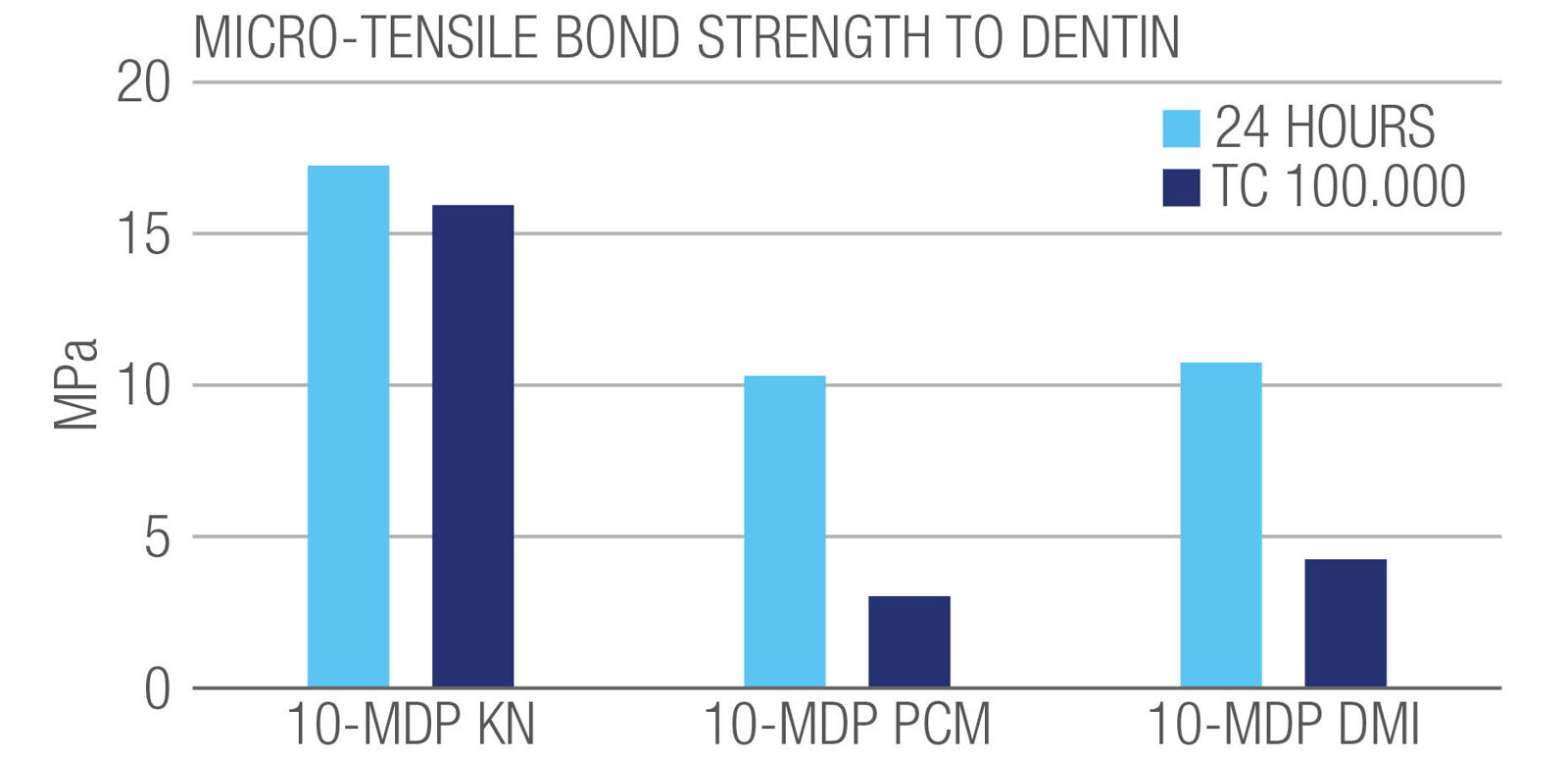 Different MDP monomers offer different levels of purity and a different bonding performance. Three experimental self-etch primers were prepared consisting of 15 wt.% 10-MDP provided by different sources: KN (Kuraray Noritake Dental), PCM (Germany) or DMI (Designer molecules, USA). Data courtesy of Dr Kumiko Yoshihara. (Image: Kuraray Noritake Dental)