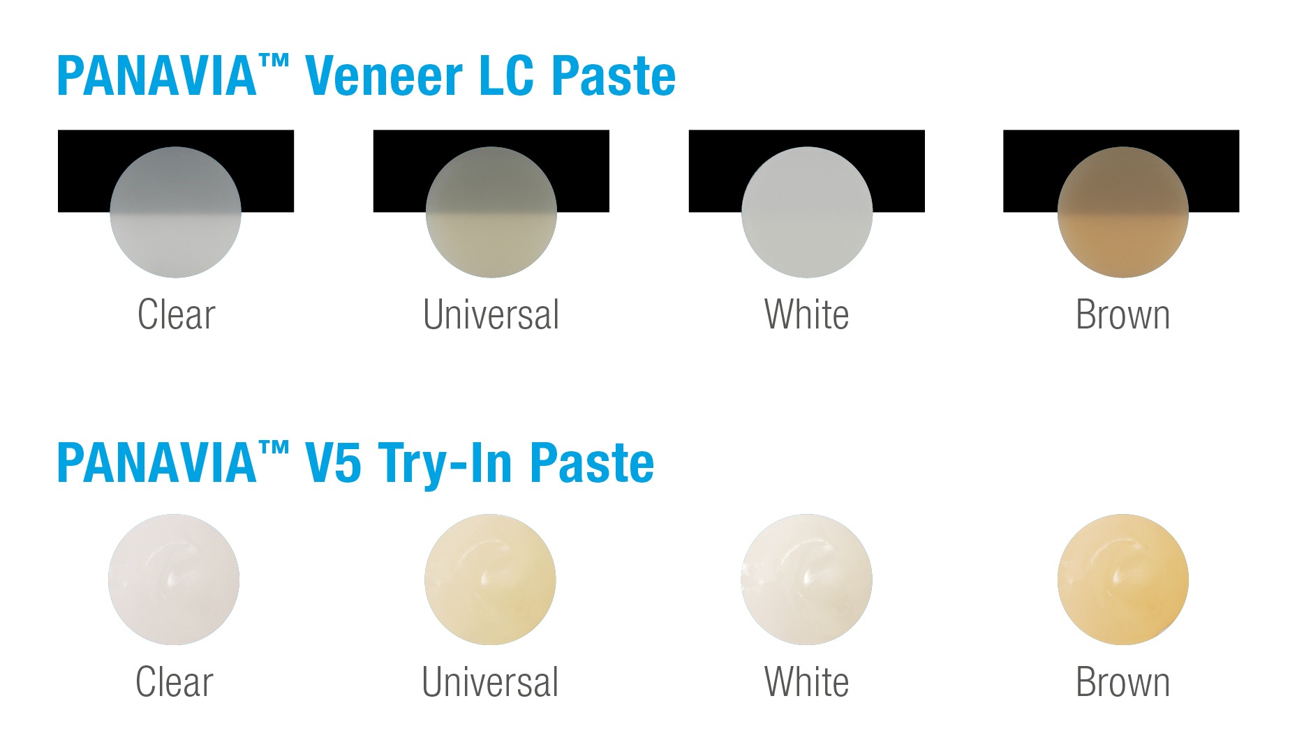 PANAVIA Veneer LC is available in four shades—Clear, Universal/A2, Brown/A4 and White—with corresponding PANAVIA V5 try-in pastes. (All images: Kuraray Noritake Dental)