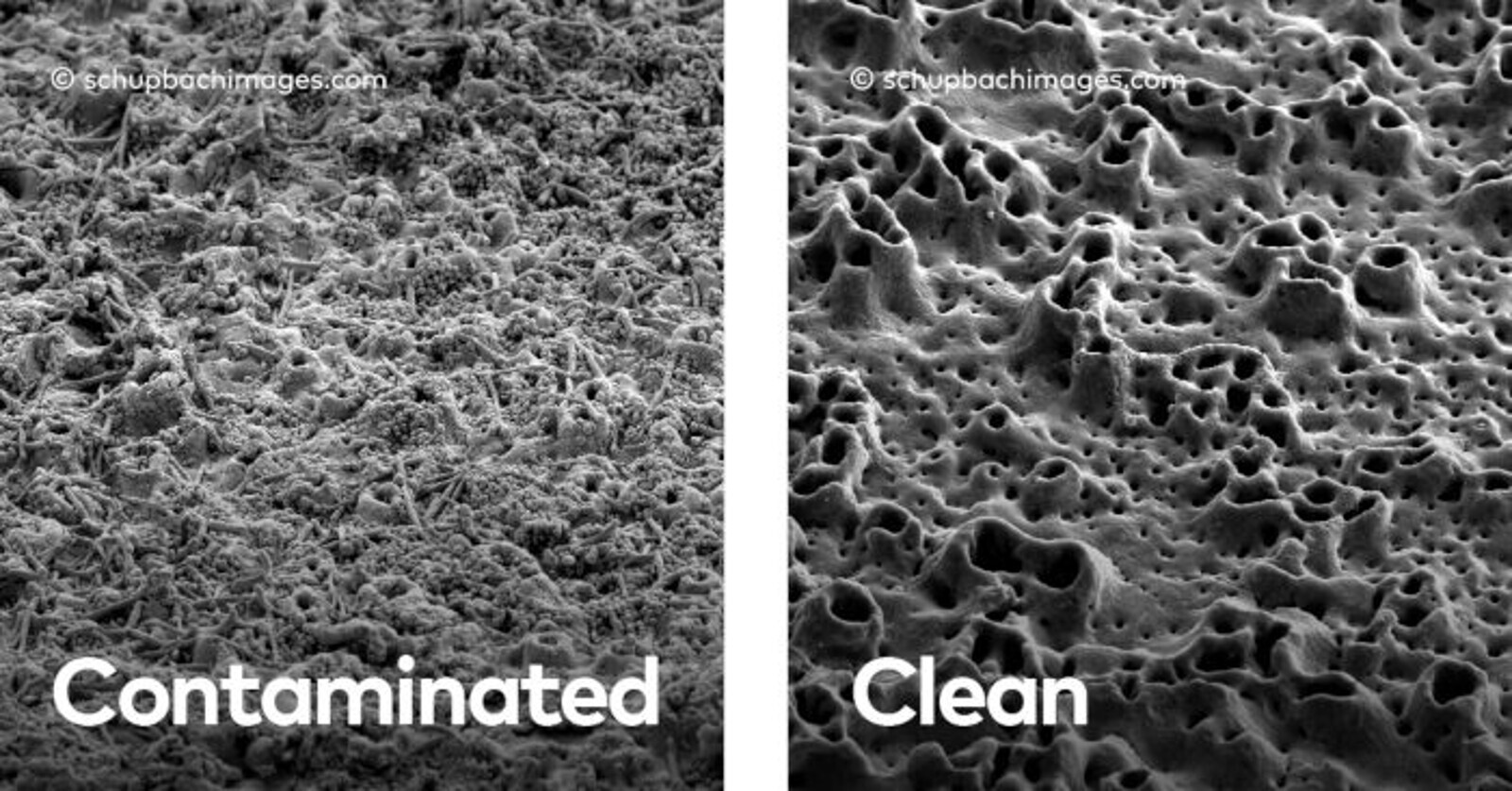 Contaminated versus clean titanium implant surface after cleaning with GalvoSurge. (Image: Nobel Biocare)