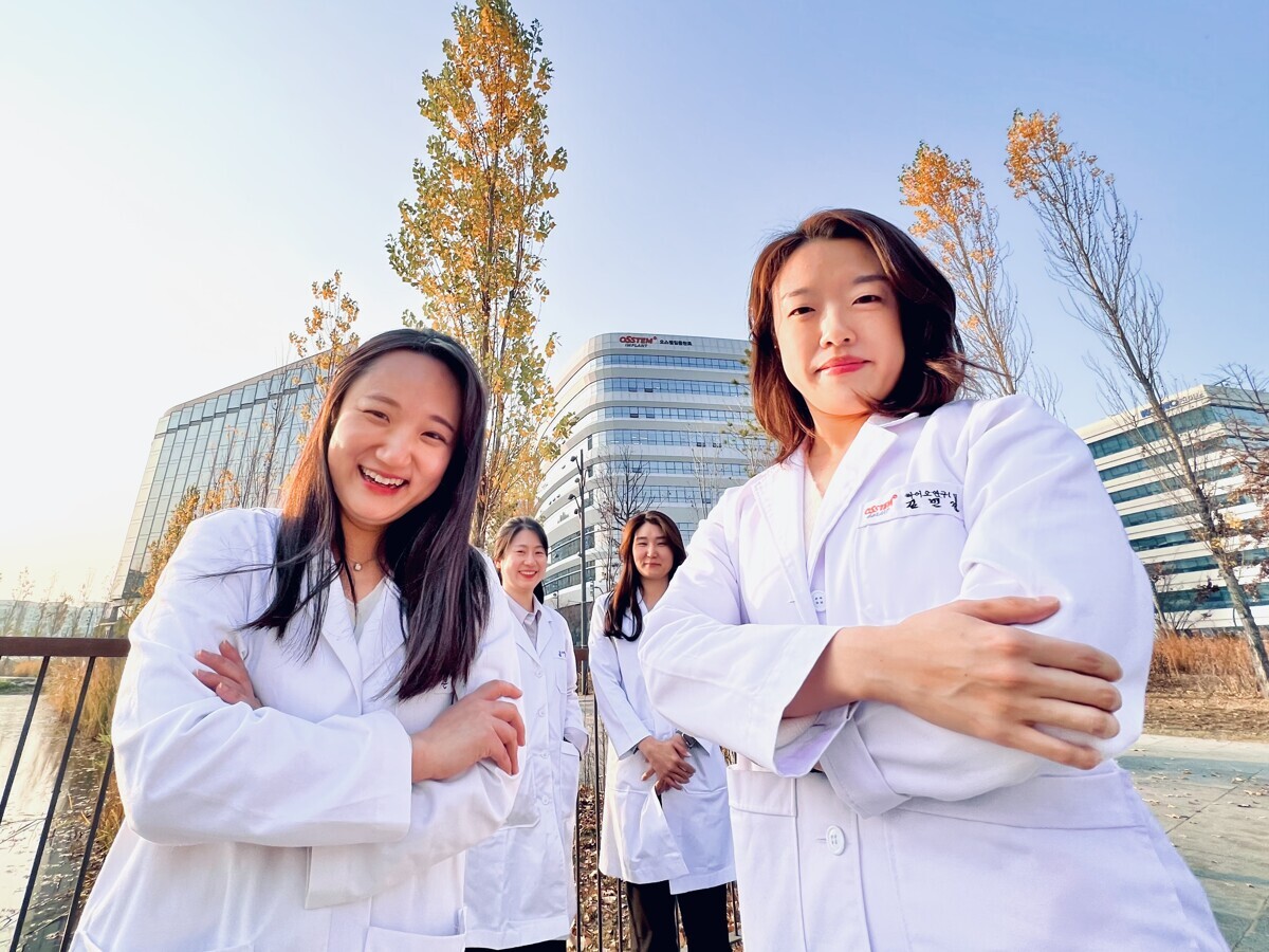 Outstanding women scientists at Osstem Implant’s Biotechnology R & D Center are striving to develop next-generation biomaterials used for dentistry and plastic surgery. Front left: Jeong-Ju Kim, senior researcher on the breast implant development team at Osstem Implant’s Biotechnology R & D Center, and front right: Min-Jeong Kim, senior researcher on the biomaterials development team.