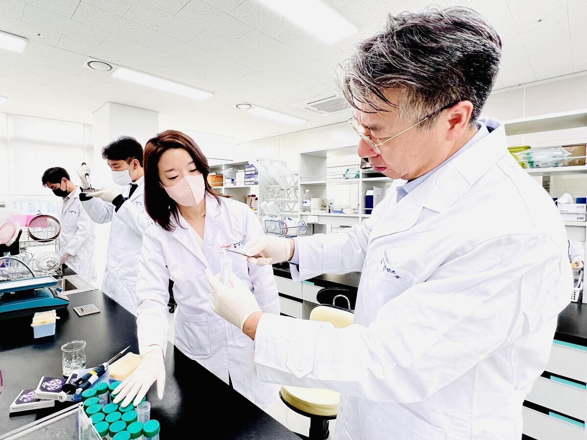 Ju-Dong Song, director of the Biotechnology R & D Center, and Min‑Gyeong Kim, senior researcher, test the performance of TissueMax.