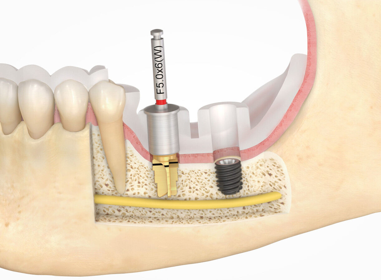 The hole design consists of closed type and open type. The closed type enables the dentist to drill precisely and stably, while the open type allows the dentist to easily place implants in the most posterior positions with insufficient vertical space by approaching from the side.