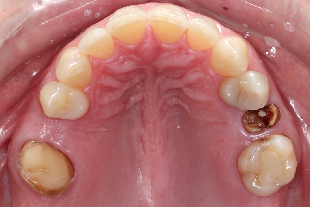 A 38-year-old female patient presented to the dental office reporting social discomfort when smiling, owing to the absence of both maxillary second premolars (Figs. 1a– c, Figs. 2a–c & 3). Clinical examination revealed that tooth #16 had an intra-radicular post and had been prepared for a crown, but the crown was missing, and a cavity was noted on the distal surface of tooth #14. Overall, the patient exhibited a healthy periodontal condition. She was a non-smoker and did not present with any comorbidities or systemic health issues. CBCT imaging showed adequate bone quality and quantity at both sites and no signs of acute infection. Additionally, a residual root was identified at site #15 beneath the already healed gingiva.