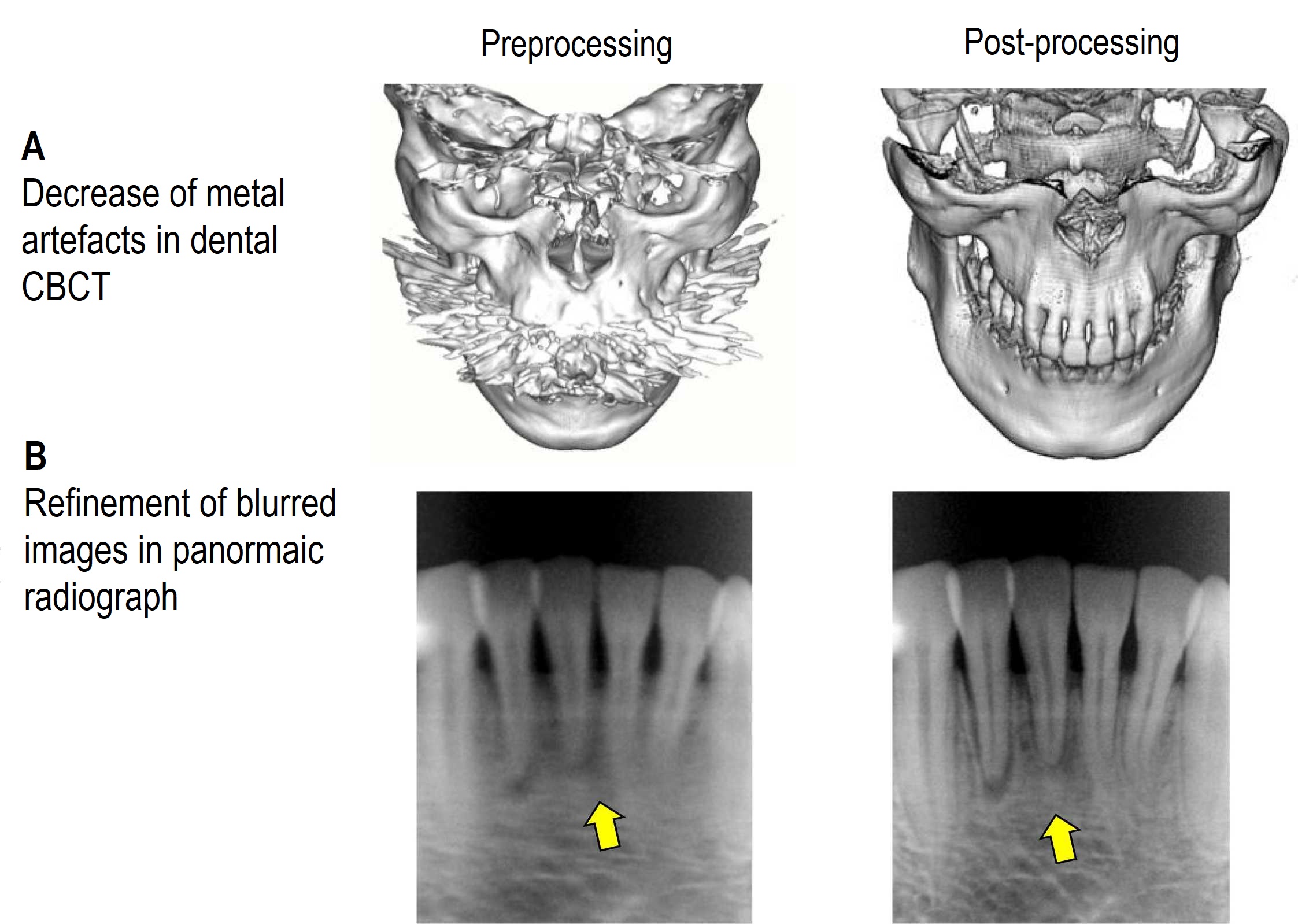 Post-processing employing artificial intelligence (AI) in dental CBCT images (A) and panoramic radiographs (B) significantly reduces metal artefacts and enhances image clarity. These improvements in image quality support more accurate diagnosis, exemplifying the transformative impact of AI in dental imaging.6