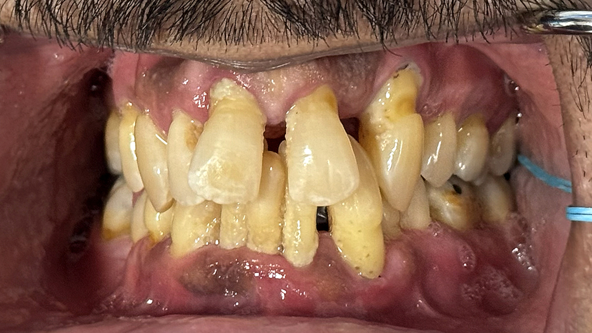 Fig. 1a: Pre-op situation. Intra-oral retracted view of the maxillary teeth, showing advanced periodontal disease and anterior spacing. (All images: Dr Scott D. Ganz)