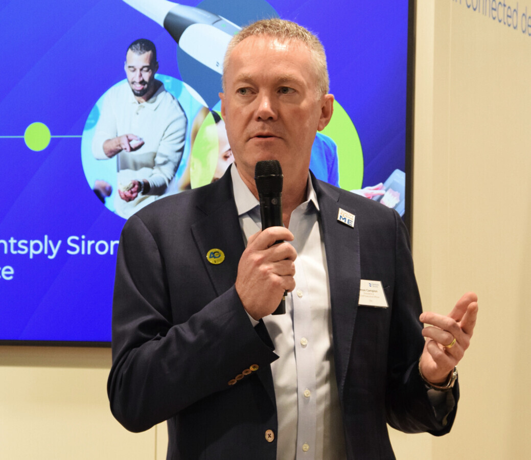 Dentsply Sirona CEO Simon Campion speaking at the International Dental Show 2025 in Cologne in Germany. (Image: Dental Tribune International)