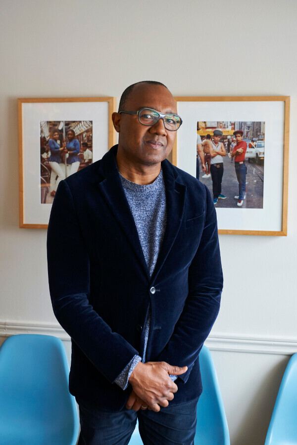 Dr. Montague in his dental clinic waiting room; on the wall are photographs by Jamel Shabazz.(Image: Justin Aranha)