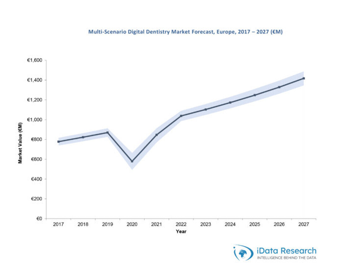 The European digital dentistry market, which includes CAD/CAM systems, CAD/CAM materials and dental 3D printers, is projected to experience double-digit growth reaching over €1.4 billion ($ 1.7 billion) by 2027, as digital technologies have begun to revolutionise the European dental prosthetics market reaching into the foreseeable future. This will be driven by strong market growth in the intra-oral scanner and dental 3D printing space.