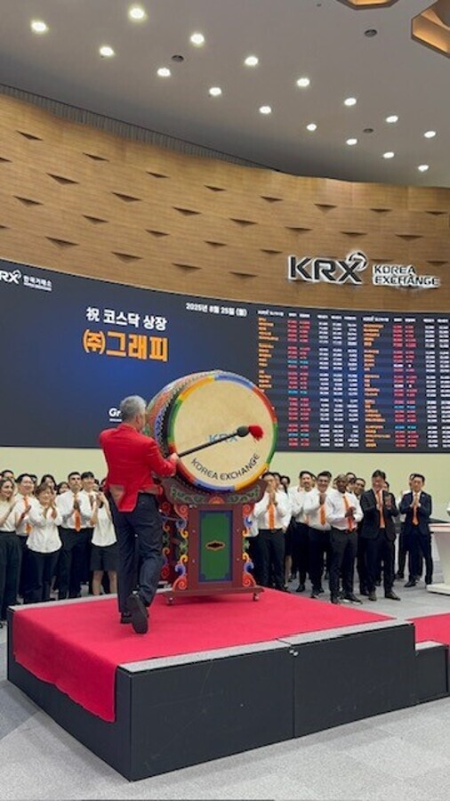 Graphy CEO Un-seob Sim strikes a ceremonial drum in celebration of the company’s listing on South Korea’s KOSDAQ stock exchange.