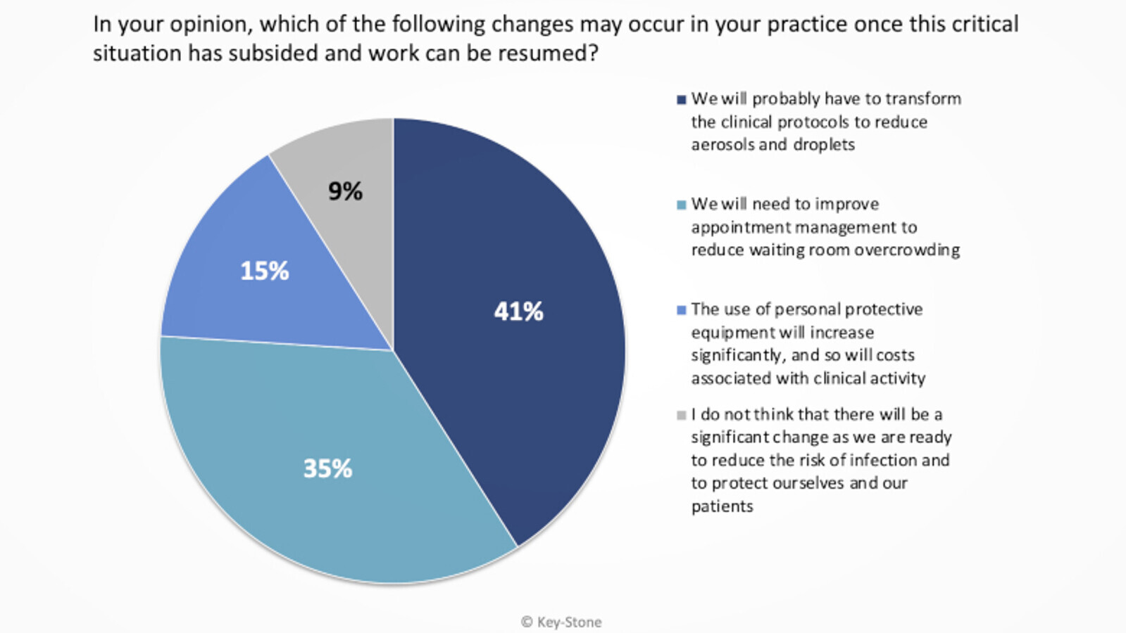 Italian dentists are already aware of these changes taking place. In a survey conducted by Key-Stone in collaboration with Italian dental manufacturer IDI evolution in the last week of March, 41% of the dentists who responded stated that they would probably have to transform the clinical protocols, and 35% thought that they would need to improve appointment management. Only 15% of the respondents referred to an increase in costs as a consequence of elevated personal protective equipment use, and 9% (18% of respondents older than 55) thought that the pandemic would not radically affect their established routines. Respondents were only able to choose a single answer to each question to deliver quality insights.