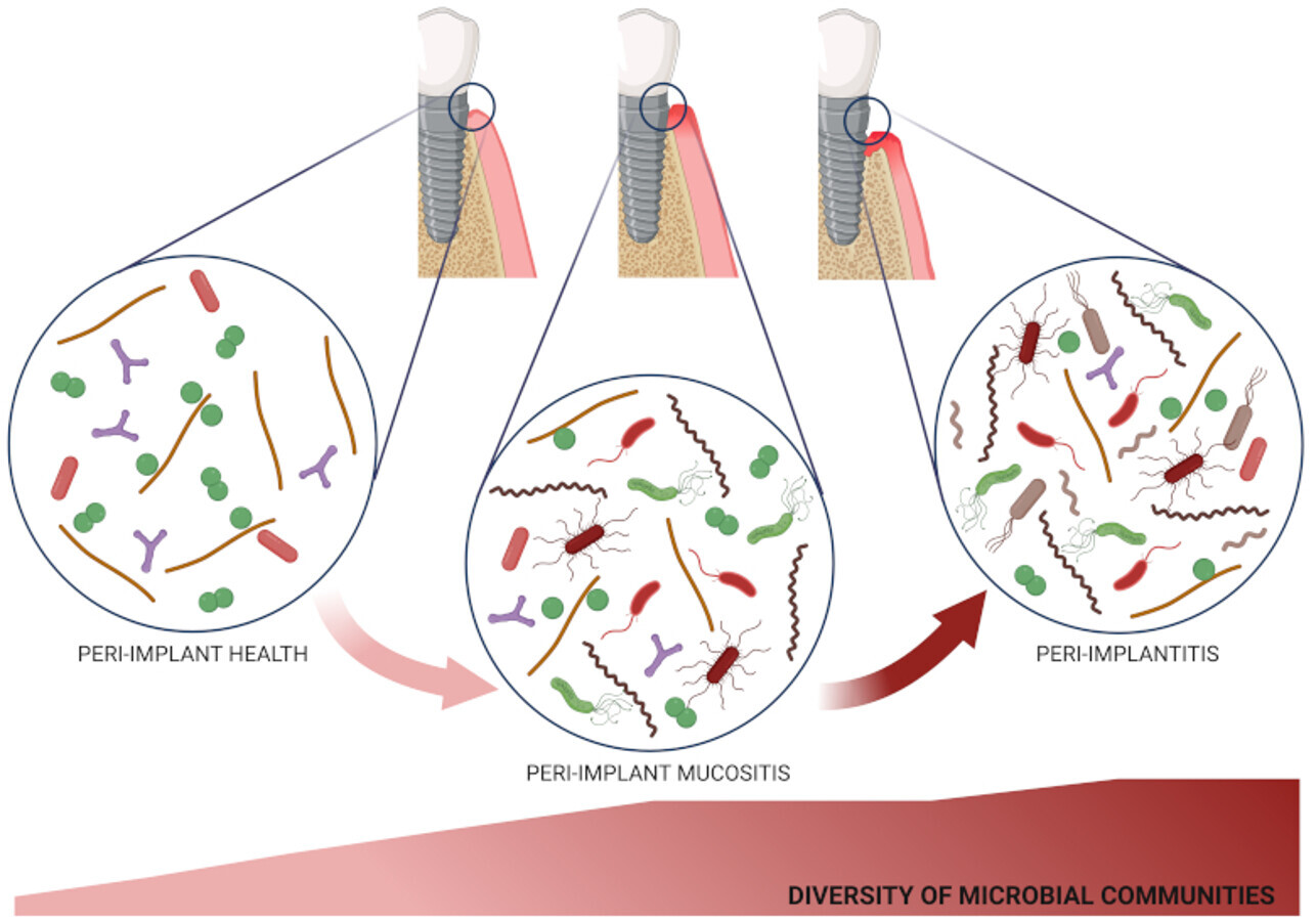 The increased microbial diversity of submucosal biofilms during the transition from health to peri-implant mucositis and then to peri-implantitis. (Image: Journal of Dental Research. First published in Belibasakis GN and Manoil D, J Dent Res 2021; 100(1): 21-28. Reproduced with permission from SAGE in agreement with the Creative Commons CC-BY license)