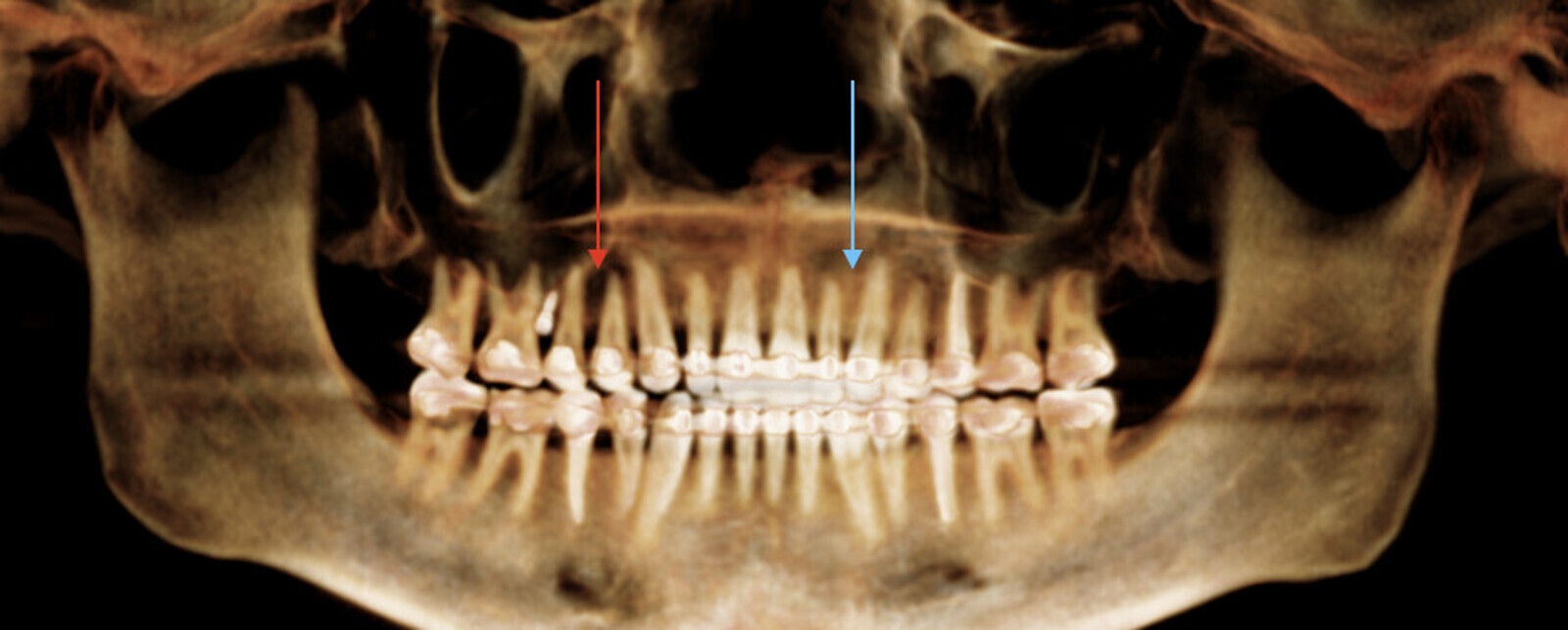 Clearly, TAD placement will be determined in part by the mechanics they are used for. In addition to the mechanics used for TAD anchorage, there are important factors of individual anatomy that should be considered. A recent cone beam computed tomography scan, or panoramic radiograph, should first be obtained. This radiograph can be used to evaluate root divergence, bone height and, to some extent, bone density. Figure 1 demonstrates two areas indicated by both red and blue arrows. The red arrow indicates a radiolucent area, indicative of lower bone density. This would be an area where TAD placement would not be indicated. In contrast, the blue arrow indicates a radiopaque area, suggesting greater bone density and an area thus more ideal for TAD placement.