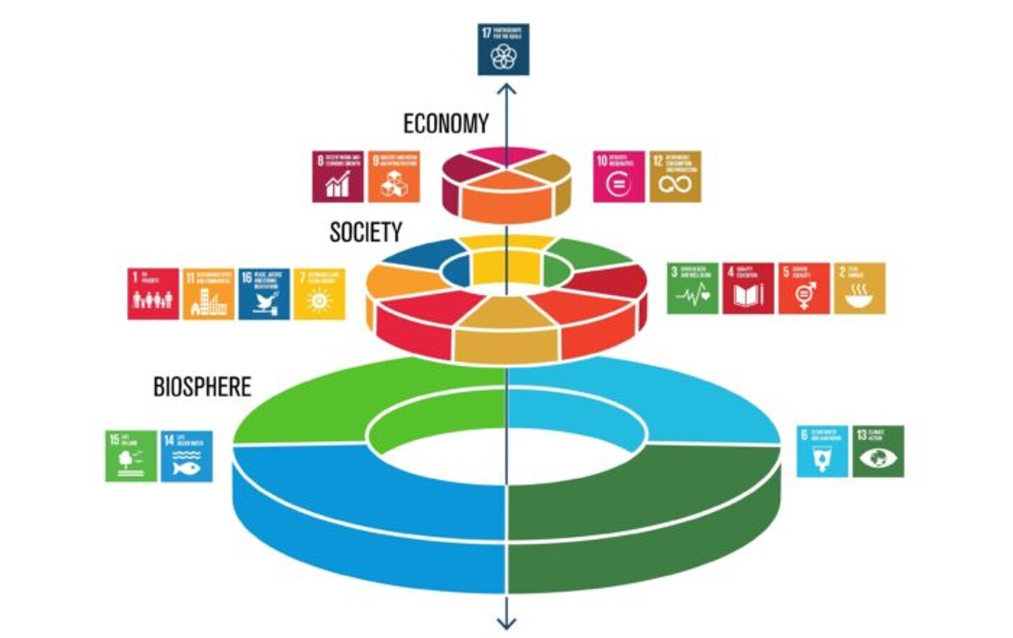 Even though the SDGs provide a structured and focused course of action with clear indicators, it can still be a daunting task to implement them in the day-to-day practice. An alternate way to frame the workflow of the SDGs is the wedding-cake model created by Prof. Johan Rockström and Pavan Sukhdev. This model was aimed at the food industry, and they layer the SDGs into four layers like a wedding cake, using environment (biosphere), society and economy for the first three layers, and finally, adding SDG 17, called “partnerships for the goals”, on top.