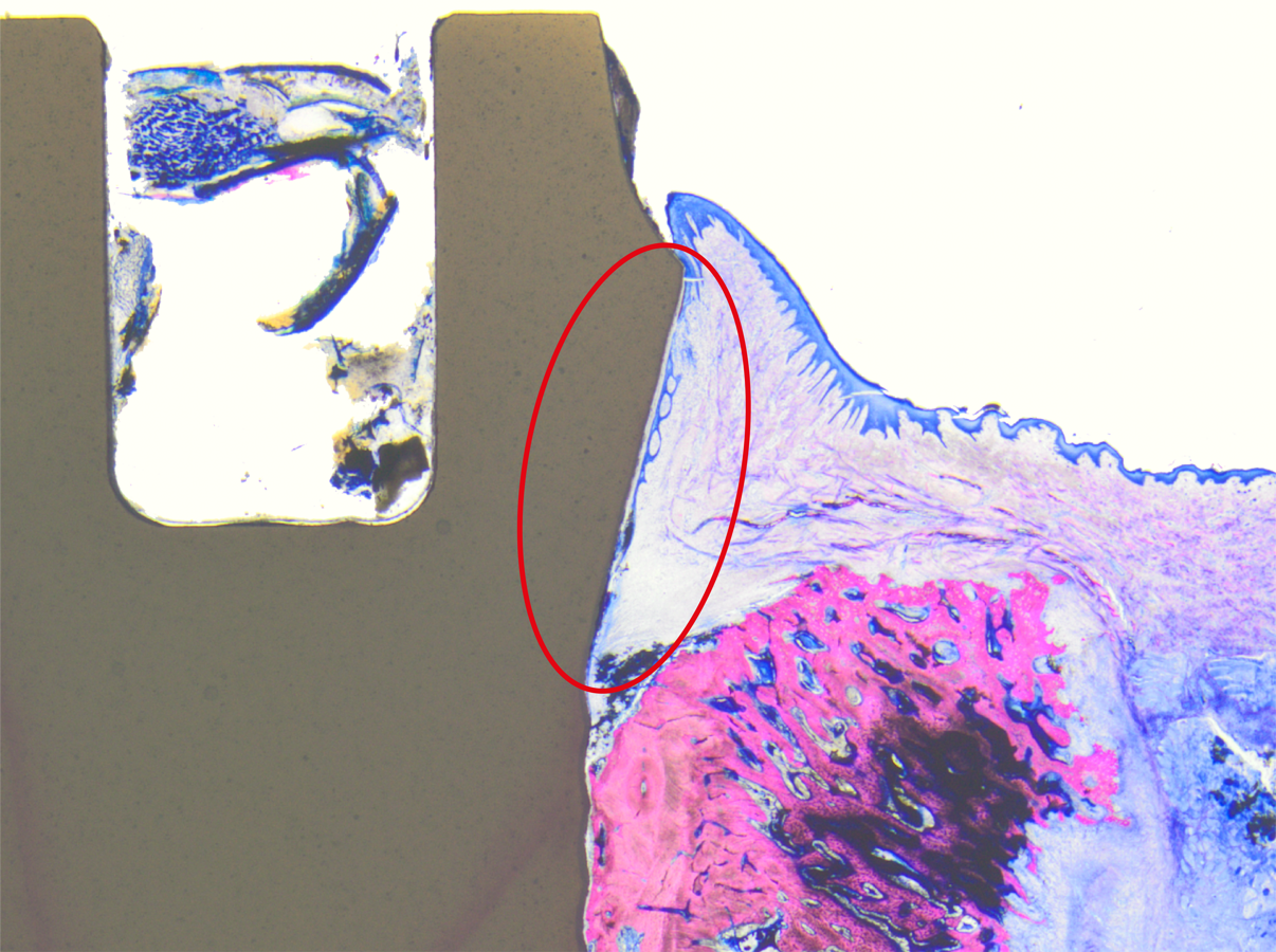 Histology of a Patent implant (left) four weeks after insertion; thanks to the soft-tissue bond with the transmucosal implant surface (red circle), no plaque is visible below the soft-tissue level. (Image: Dr Peter Schüpbach)