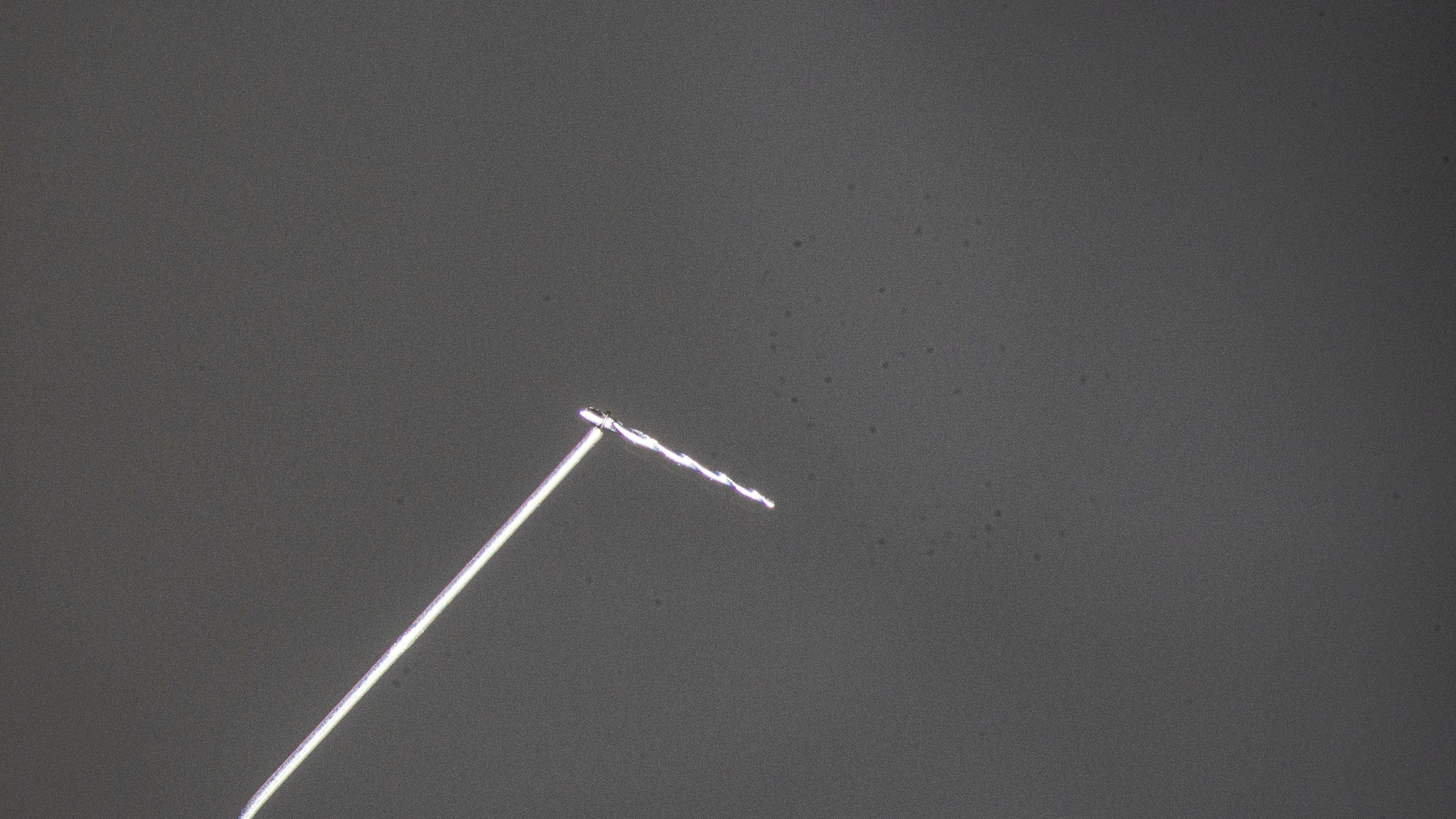 After the removal of the gutta-percha and cleaning of the root canals, it was apparent that a large amount of the dentine had been removed from the orifice of the mesiobuccal canal (Fig. 31). Most probably, this had occurred during an attempt at removing the broken file in the previous treatment. Fortunately, there were no visible signs of perforation in the orifice. The damaged wall was sealed with composite resin (Fig. 32). Irrigation of the mesiobuccal canal with the AutoSWEEPS mode and sodium hypochlorite and inspection under 16× magnification revealed two pieces of the broken instruments (Fig. 33), complicating treatment. The tips of both files were visible, but both were also jammed. An attempt at removal with an ultrasonic file was ineffective, so the flat SWEEPS 300/20 fibre tip was used with the AutoSWEEPS mode at a power of 1.2 W. After a few minutes of irrigation with sodium hypochlorite and EDTA, both file pieces started to move a little, indicating that both were removable. Both pieces were retrieved with a lasso loop tool (BTR Pen, CERKAMED; Fig. 34). A periapical radiograph was performed to confirm that there were no more broken file pieces (Fig. 35).