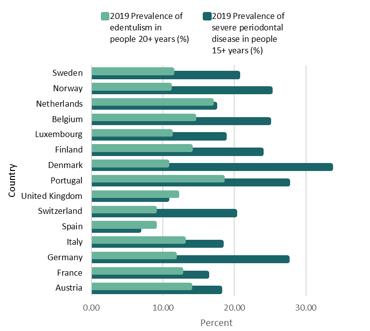 Prevalence of edentulism and severe periodontal disease by country in Europe in 2019.13, 14