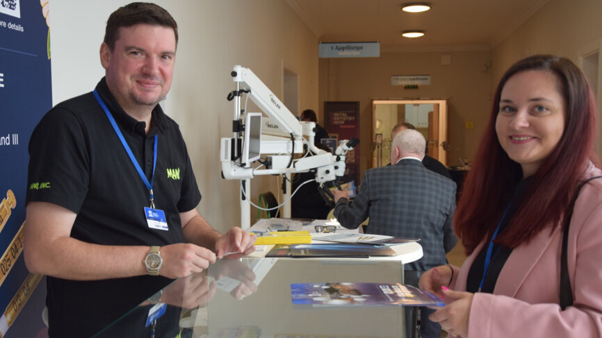 ROOTS SUMMIT attendee getting more information on a surgical loupe from Zumax Medical.