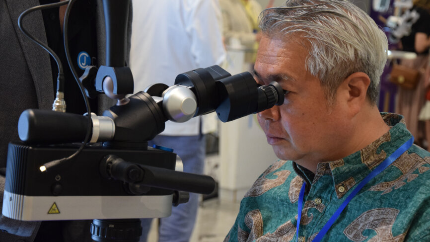 ROOTS SUMMIT attendee trying out a dental surgical microscope from Seiler.