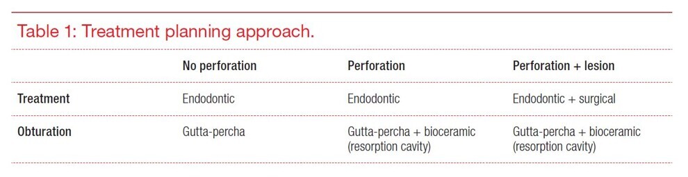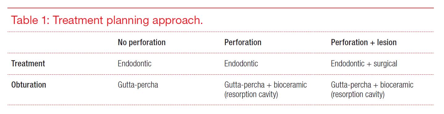 In order to diagnose IRR, it is recommended to take a CBCT scan. 3D diagnostics is crucial for creating the treatment plan. The shape of the area of resorption and perforation of the root wall are the most important factors for determining the treatment planning approach (Table 1). The cases presented have demonstrated that a combined endodontic and surgical approach is the most suitable option for cases of IRR that has perforated the root wall and is associated with a lesion or destruction of the surrounding bone.