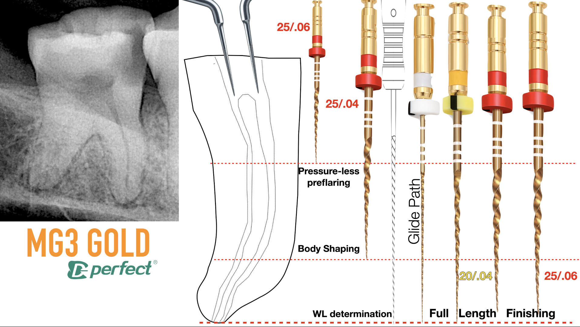 The patient presented with a mandibular first molar with advanced symptomatic pulpitis and apical periodontitis. Taking into consideration the constricted appearance of the root canals on the digital radiograph, MG3 Gold was the best suited for the situation owing to the high cutting efficiency. Mechanical pre-flaring with the 25/0.06 file was done to facilitate body shaping using the 25/0.04 file and a secured mechanical glide path to a final size of 30/0.04 in the five-canaled molar.