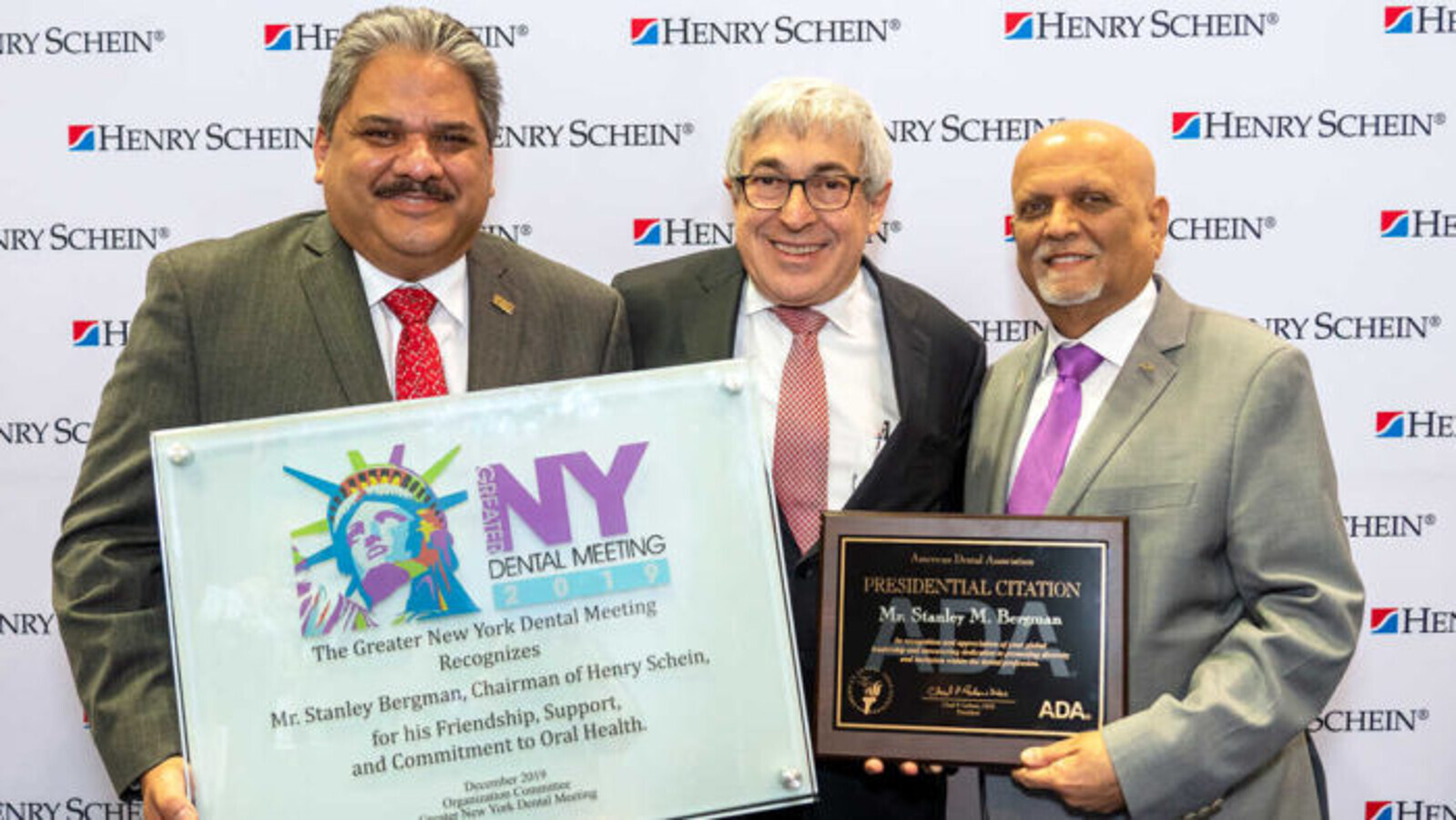 From left to right: Dr Lauro Medrano, General Chairman of the Greater New York Dental Meeting; Stanley M. Bergman, Chairman of the Board and Chief Executive Officer of Henry Schein, Inc.; and Dr Chad Gehani, President of the American Dental Association. (Image: Dental Tribune US)