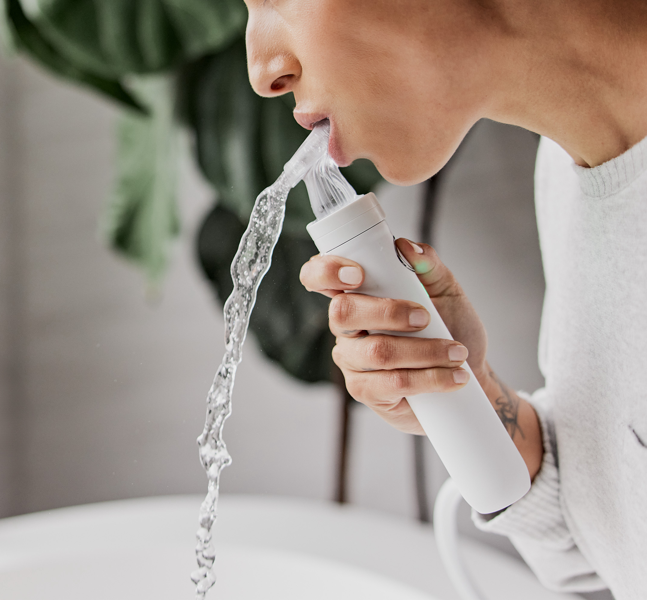 The Proclaim device with its 3d-printed mouthpiece is a custom-jet oral irrigator that uses up to 60 precision jets to deliver a personalised and automated 7-second deep cleaning. (All images: Proclaim)