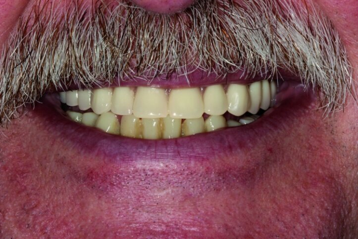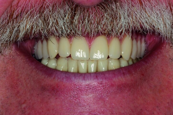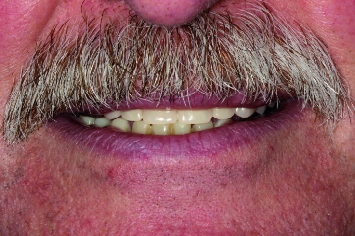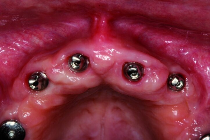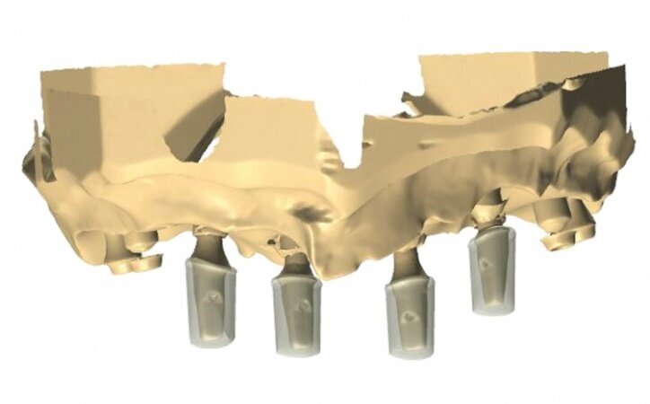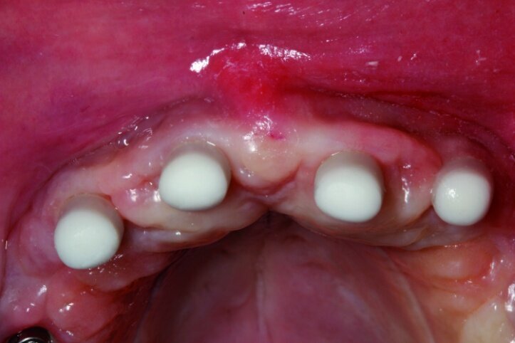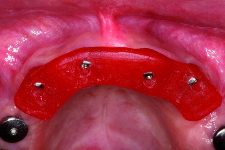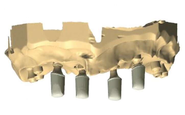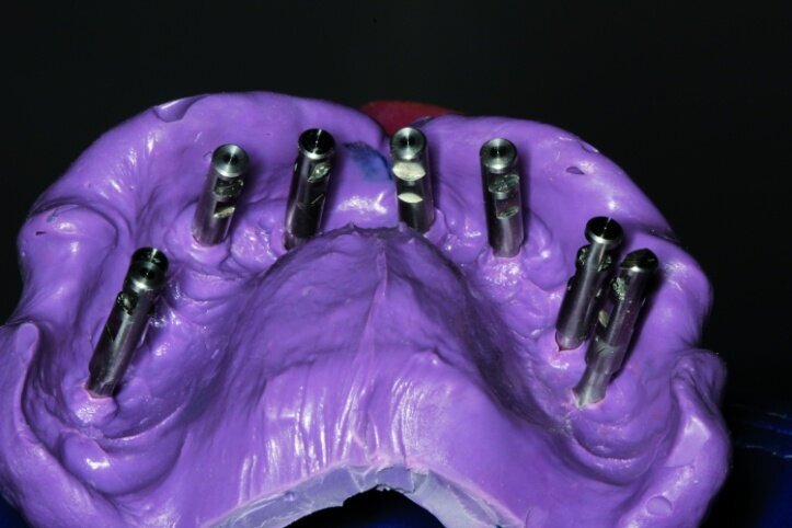 It became clear that treatment in this case would require more time and hence in the period between procedures, from the moment treatment began till the time the final prosthesis was accepted, the patient should be provided with a convenient temporary restoration. Being fully aware of advantages and disadvantages of different solutions, the patient decided on a restoration based on eight implants with a combined mounting and the use of screw-based abutments and telescopic crowns of implants. Application of telescopic crowns at the front of the maxilla allowed us to make a very convenient temporary prosthesis based on four telescopes.