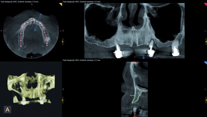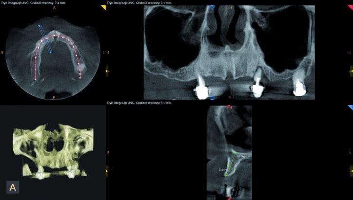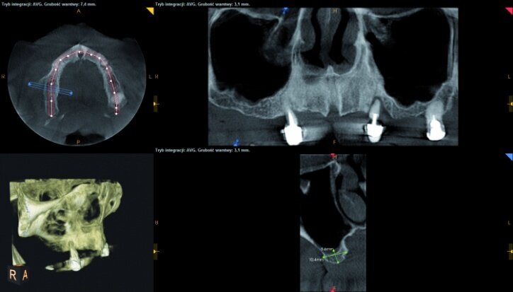 During the process of treatment planning, a few proposals for prosthetic solutions were presented, including permanent and temporary restorations, based on existing teeth as well as implants of various combinations. After analysing CBCT scans (Figs. 3–6) it could be concluded that implantological treatment may be performed at the front maxilla without any additional procedures, however, due to significant atrophy in the lateral part and a low-lying fundus of the left and right maxillary sinus, it appeared necessary to perform augmentation procedures (sinus lift), in order to make implantation possible.