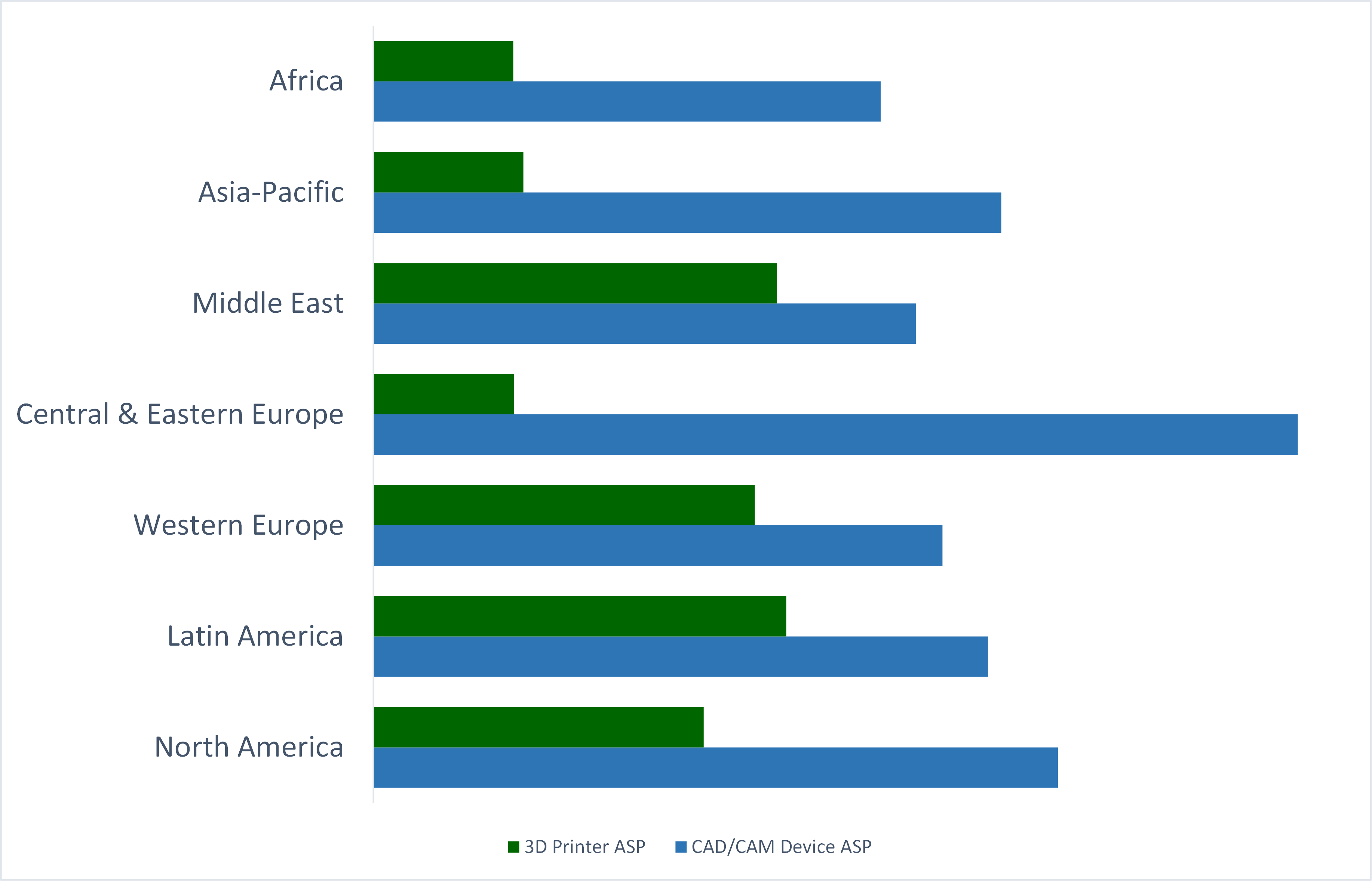 Fig. 2: Average selling prices of 3D printers and CAD/CAM devices by global region in 2024. (Image: iData Research)