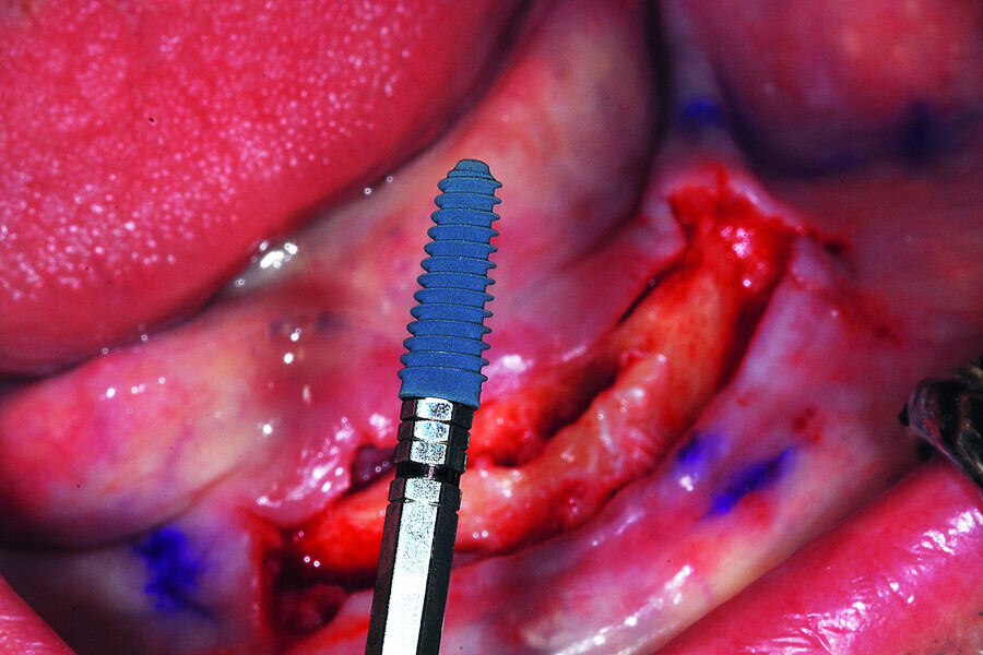 Fig. 16a: The thread design of the AnyRidge implant (a), four implants well-fixated in the mandibular symphysis (b).