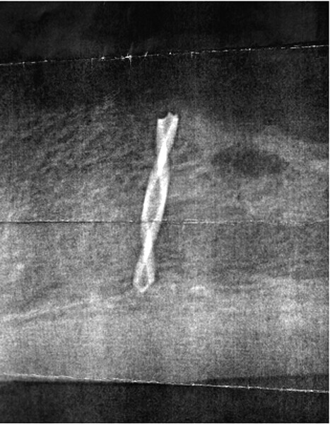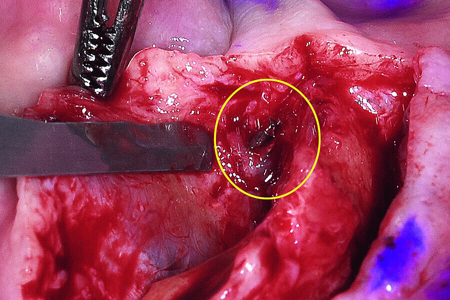 Fig. 6: Reveals the broken pilot drill ‘in the bone’.