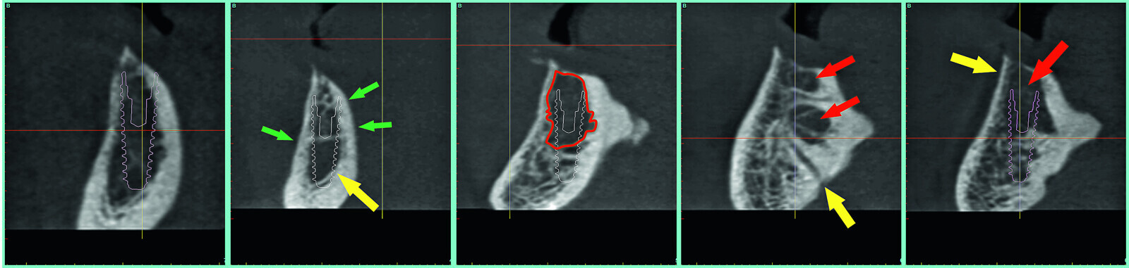Fig. 8: The need for bone reduction to flatten the ridge for implant placement (red arrows).