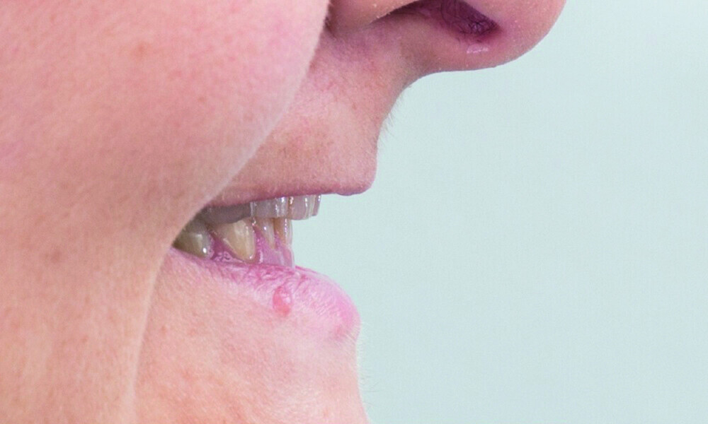 Fig. 3: Clinical situation initially. Worn anterior dentation and compensatory overeruption.