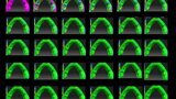 Fig. 6: Implant WG02l, buccal view. The figure shows two superimposed models. The green model is one with implants and the purple model one with inserts. The figure shows that the implant is displaced in relation to the insert, but their axes are approximately parallel to each other.