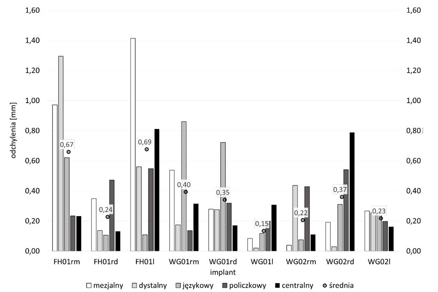 Fig. 4: Deviation levels for particular implants set with maximum point deviations. Implant naming: WG/FH, sample number, l/r, m/d (FH = freehand; WG = with guide; l = left; r = right; m = mesial; d = distal).